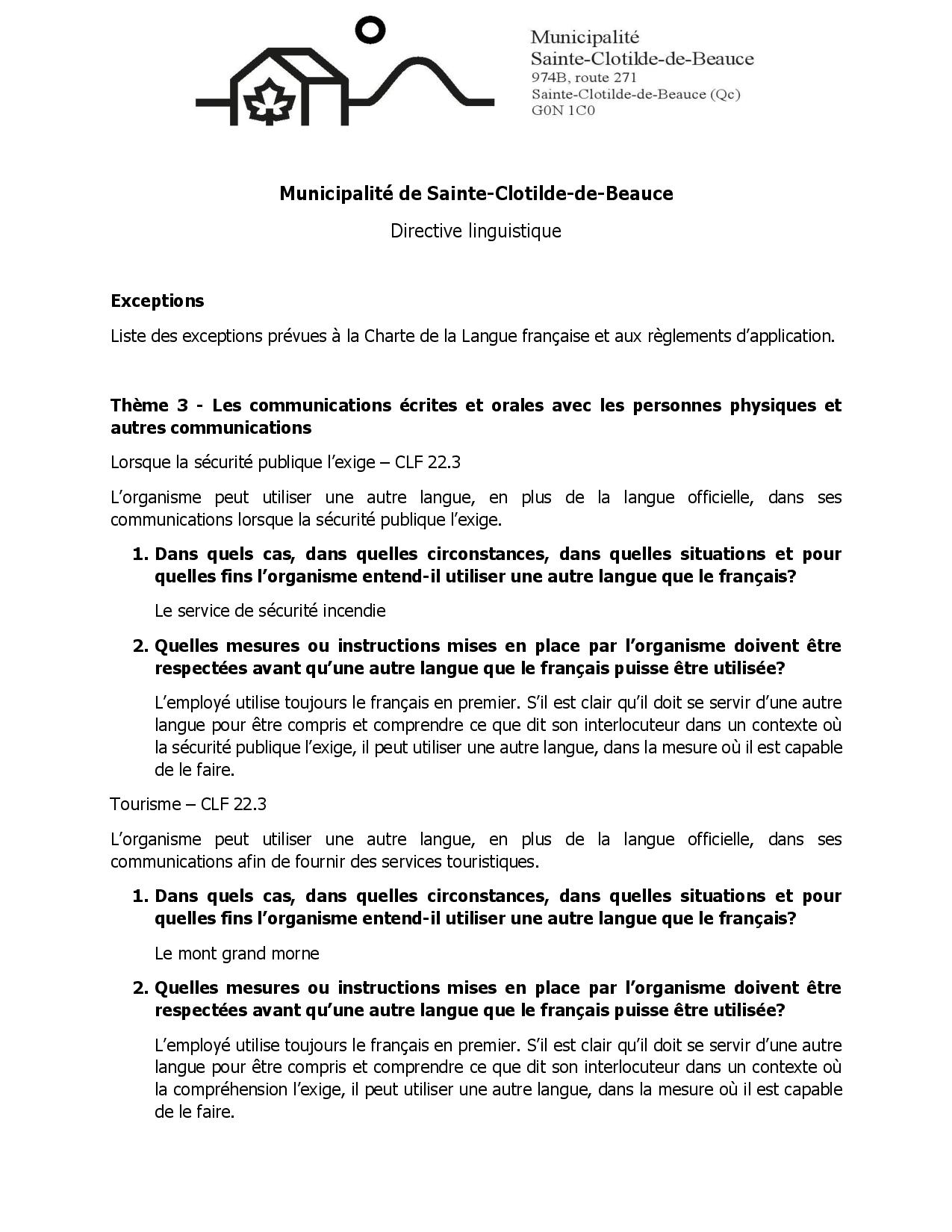 Directive linguistique Voici la directive particulière relative à l'utilisation d'une autre langue que le français adoptée par le conseil municipal, afin de rencontrer son obligation soumise par la ministère de la Langue française. |